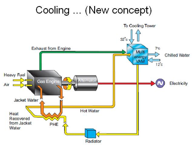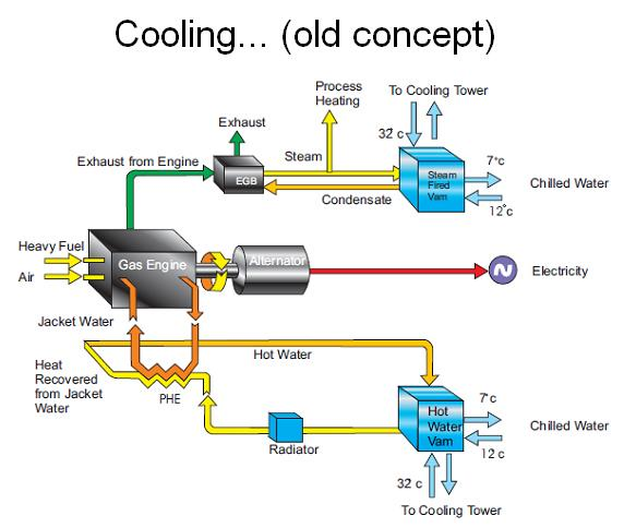 Eski alışagelmiş sistemlerde egzost hattına bir buhar kazanı konularak buharlı absorption chiller kullanılmakta ceket hattı için ise ayrı bir sıcak sulu absorption chiller kullanılmakta idi.